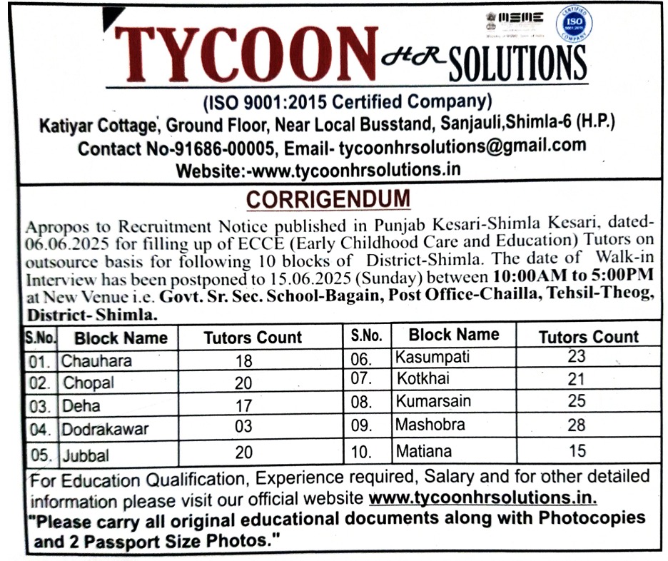 Corrigendum of ECCE (Early Childhood Care and Education) Tutors recruitment for 10 blocks in District-Shimla(190 posts)