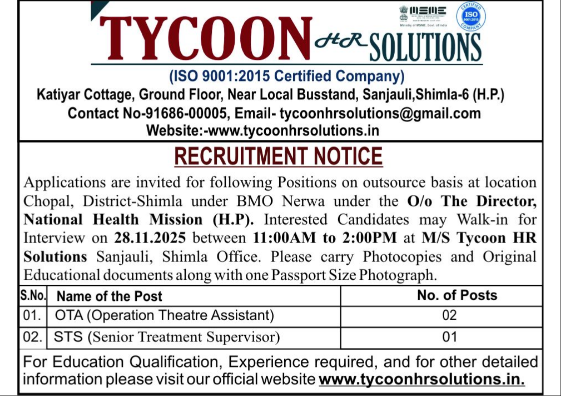 OTA and STS recruitment under BMO Nerwa(Chopal) in District-Shimla on outsource basis under the O/o The Director, National Health Mission, HP.